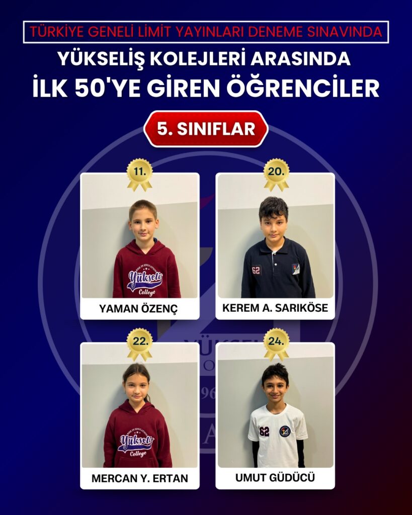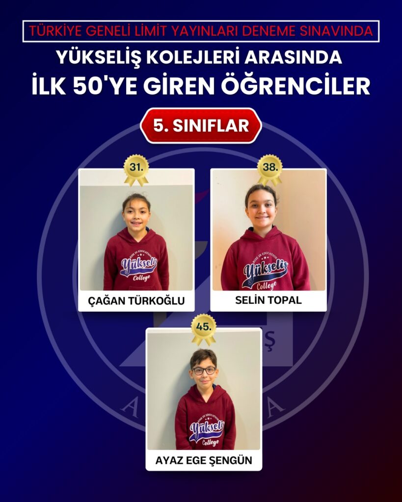 Türkiye geneli tüm Yükseliş Kolejleri arasında gerçekleştirilen deneme sınavında ilk 50’ye girme başarısı gösteren 5. sınıf öğrencilerimizi tebrik ediyoruz!